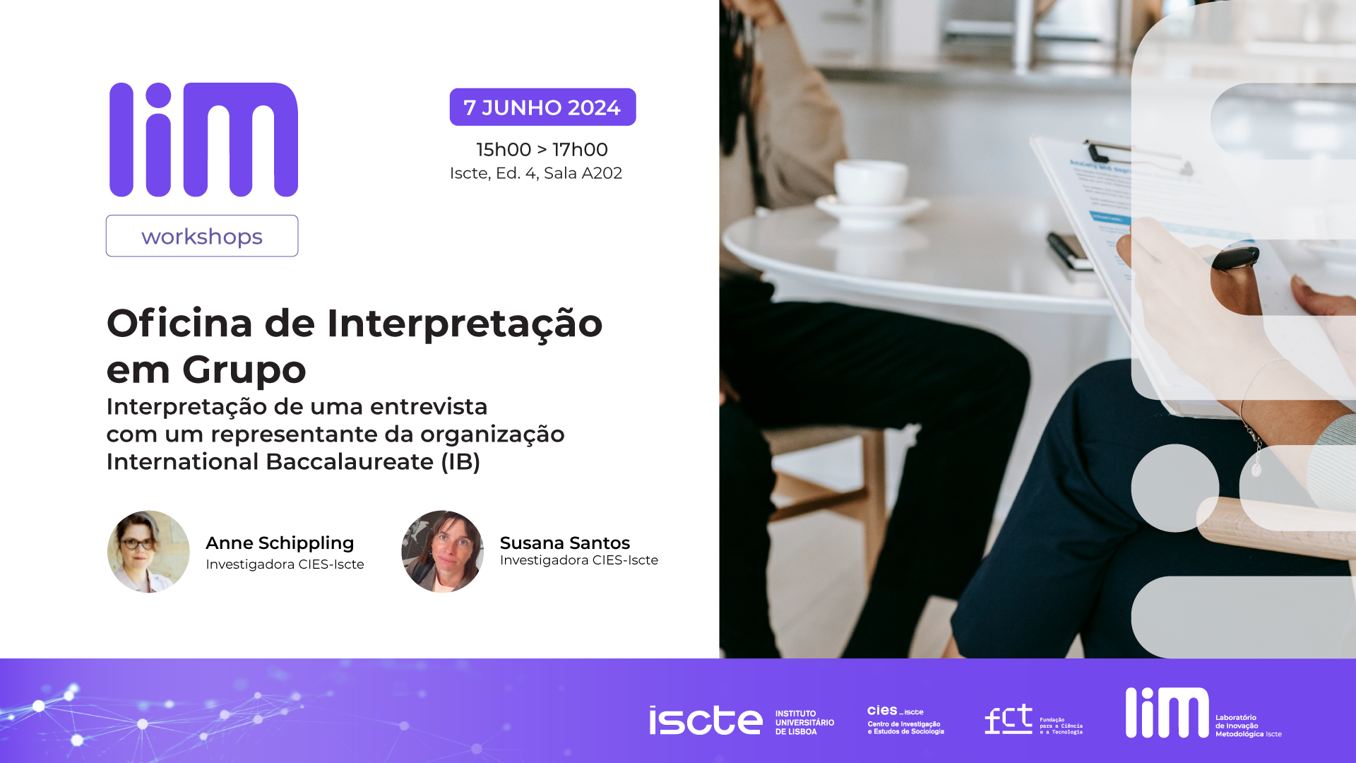 O próximo workshop do Laboratório de Inovação Metodológica decorre na tarde de 7 de junho de 2024, das 15h00 às 17h00, dinamizado pelas Investigadoras Integradas do CIES-Iscte, Anne Schippling e Susana Santos.