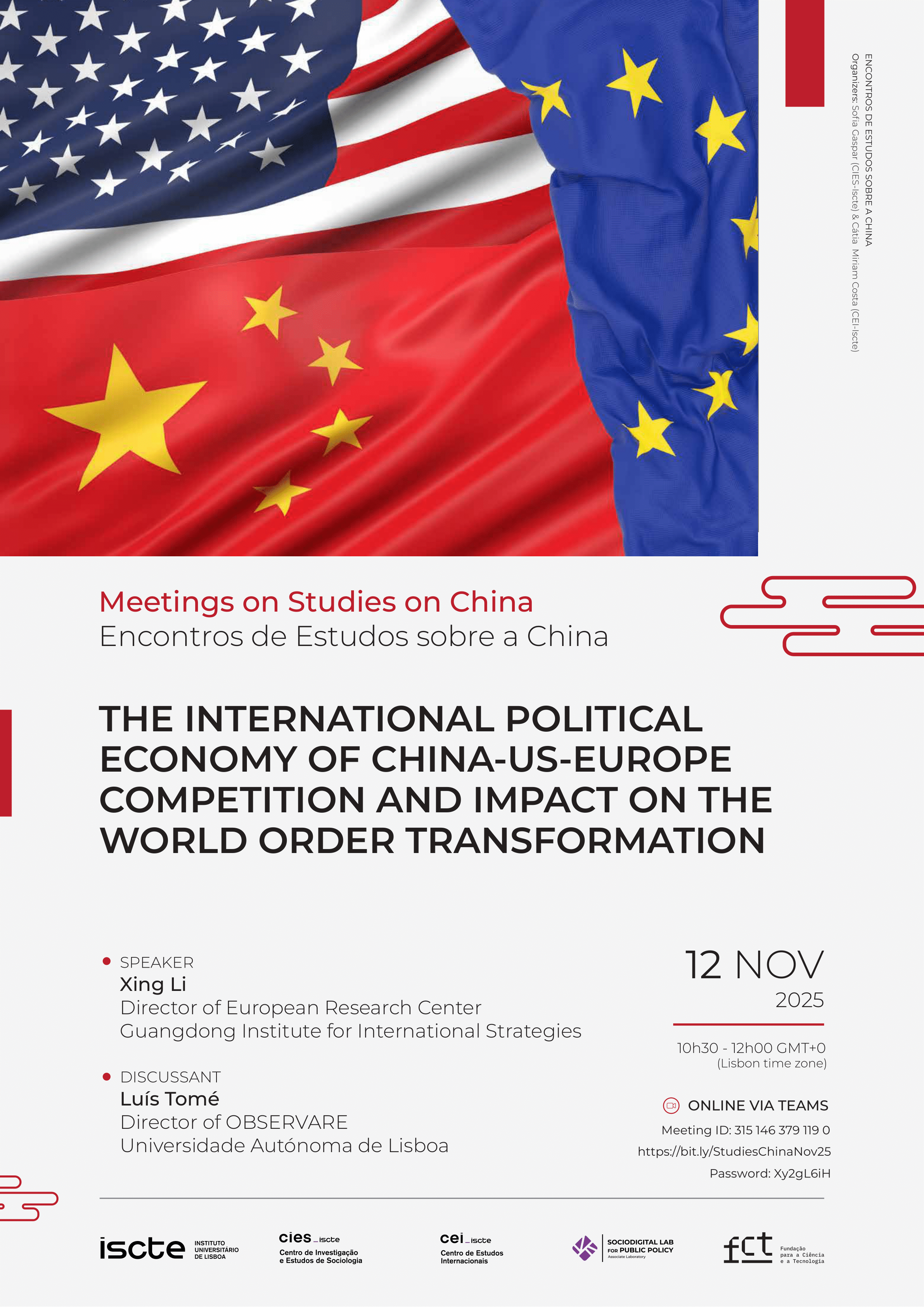 O próximo Encontro sobre os Estudos da China regressa na manhã de 12 de novembro de 2025, entre as 10h30 e as 12h00, dedicado ao tema "The International Political Economy Of China-US-Europe Competition And Impact On The World Order Transformation".