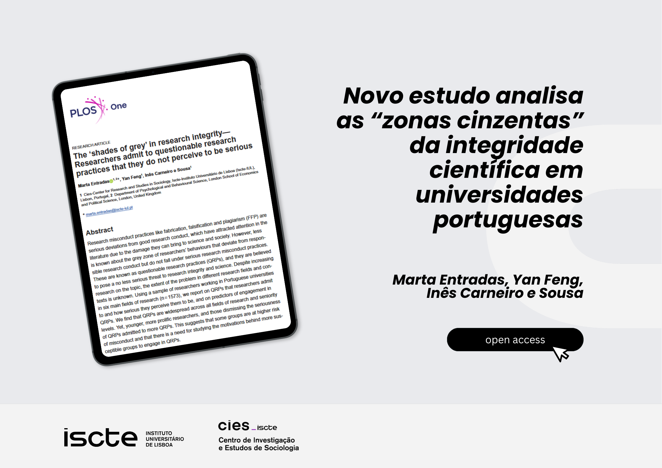 Um novo estudo publicado na PLOS One, da autoria das investigadoras do CIES, Marta Entradas (coordenadora do estudo), Yan Feng e Inês Carneiro e Sousa, aborda as “zonas cinzentas” da integridade científica. O estudo revela que há práticas questionáveis de investigação que são comuns em universidades portuguesas e, frequentemente vistas como pouco graves ou normalizadas no cotidiano académico.