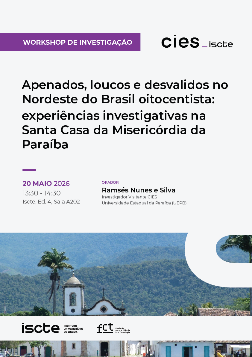 O próximo workshop de investigação do CIES realiza-se a 20 de maio de 2026 com o tema "Apenados, loucos e desvalidos no Nordeste do Brasil oitocentista: experiências investigativas na Santa Casa da Misericórdia da Paraíba".