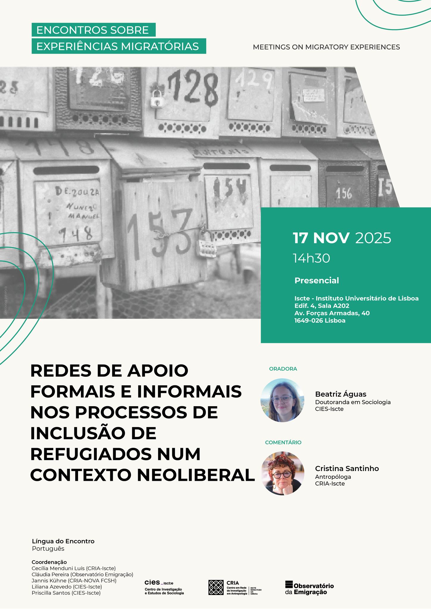 The next Meeting on Migratory Experiences, with the theme “Formal and Informal Support Networks in the Processes of Refugee Inclusion in a Neoliberal Context,” will be held on November 17, 2025, in room A202 of Building 4 at Iscte.