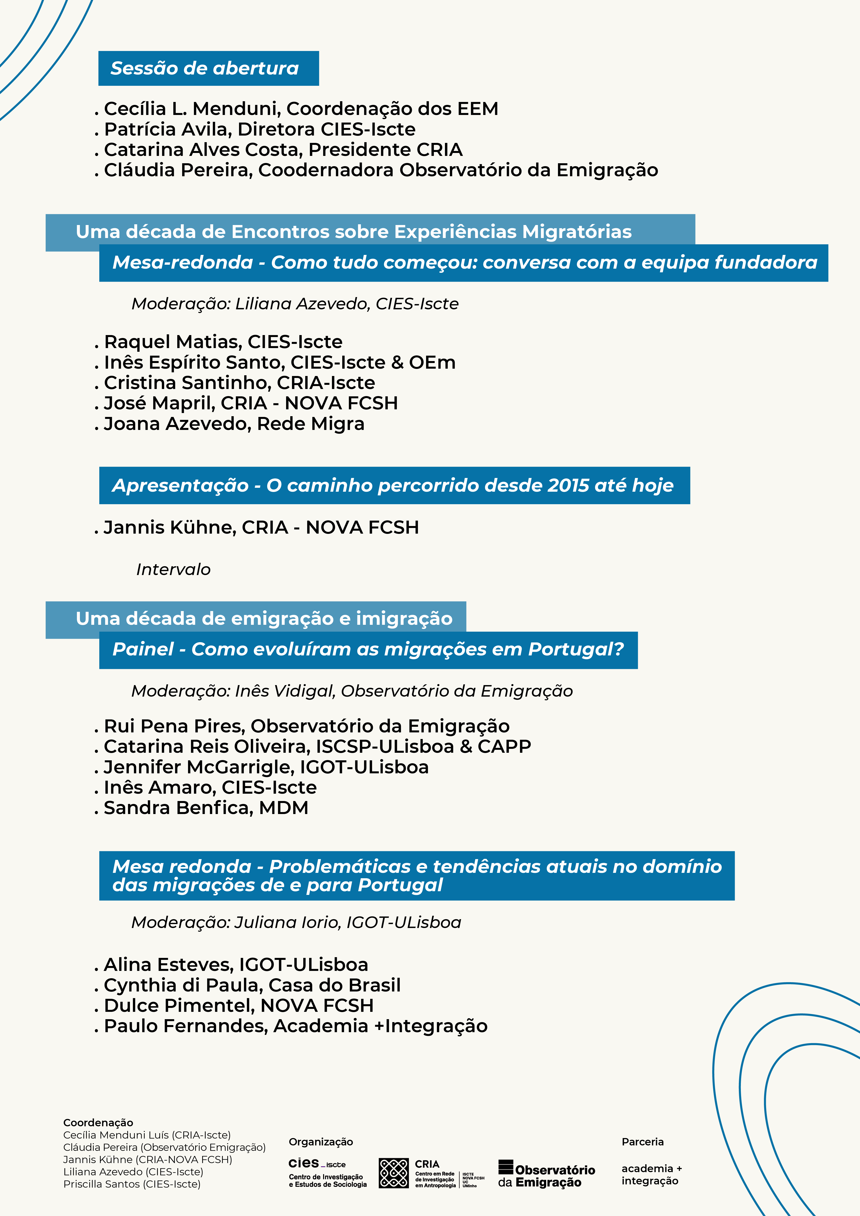 On the occasion of the 10th anniversary of the “Meetings Migratory Experiences" cycle, we have brought together a diverse group of actors to reflect on the evolution of migratory contexts and policies in Portugal (both immigration and emigration) over the last decade. We will also discuss the current issues and trends in migration to and from Portugal.