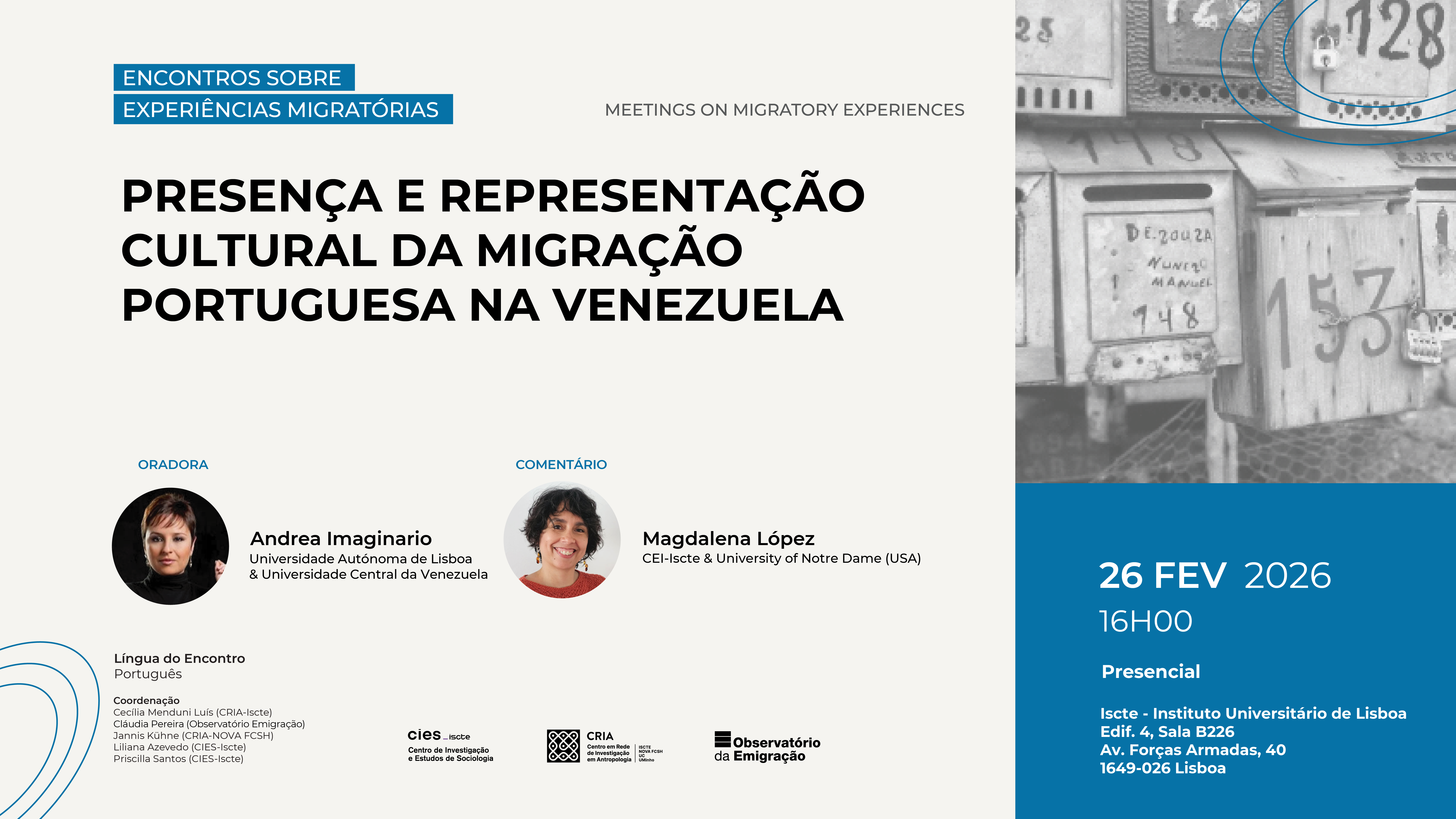 The next Meeting on Migratory Experiences will take place on the afternoon of 26 February 2026, starting at 4:00 p.m., at Iscte – University Institute of Lisbon.