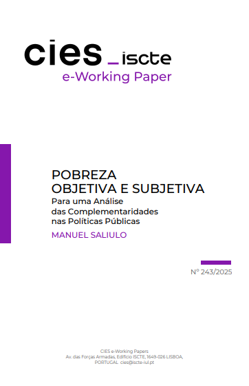 Já se encontra disponível em Open Access o mais recente CIES e-Working Paper, com o título "Pobreza objetiva e subjetiva: Para uma análise das complementaridades nas políticas públicas", da autoria de Manuel Saliulo, doutorando em Políticas Públicas.